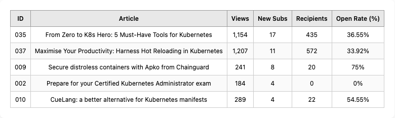 Top Performing Article: #037 (Maximise Your Productivity: Harness Hot Reloading in Kubernetes) - 11 new subscribers