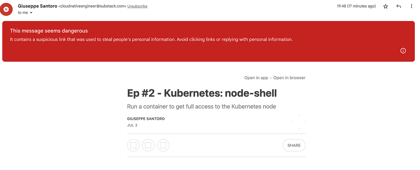 I need to ask you for a favour. Do you mind going to your spam folder and flagging my previous email with the title `Ep 2. Kubernetes: node-shell` as โNOT SPAM?